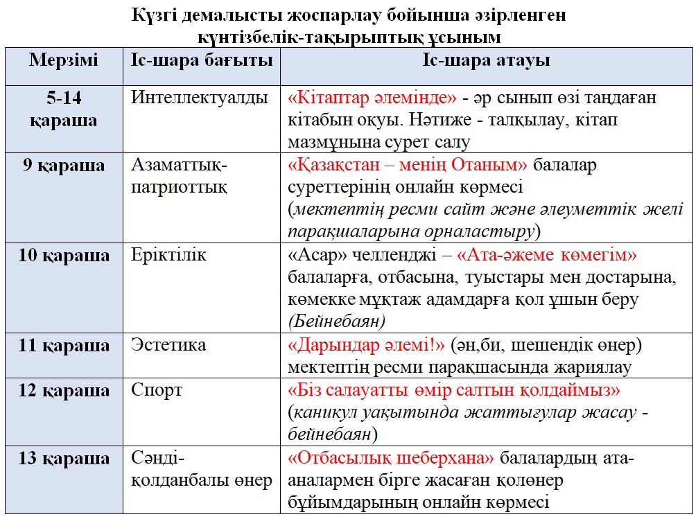 Күзгі демалысты жоспарлау бойынша әзірленген күнтізбелік-тақырыптық ұсыным