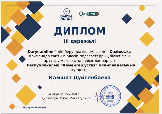 В Республиканском методическом электронном журнале «Қазақстан Ұстазы» была опубликована статья ученика 3 «Б» Эрмекова Исламбека на тему: «В здоровом теле – здоровый дух» для опубликования в